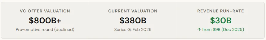 The refusal is also strategic. Anthropic already secured a landmark $30 billion Series G round in February 2026. That round valued the company at $380 billion post-money. It was the second-largest private funding deal in history. Only OpenAI’s earlier round was bigger.
