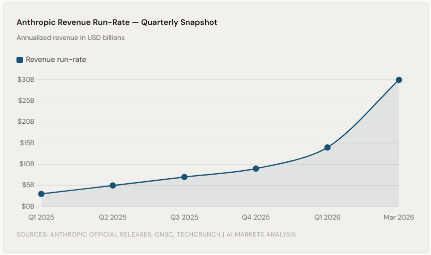 Revenue is the core driver of investor demand. Anthropic’s run-rate revenue reached $30 billion by the end of March 2026. That figure was just $9 billion at the end of 2025, per TechCrunch. The growth trajectory is nearly vertical.