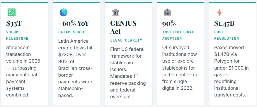 Globally, stablecoin transaction volume reached $33 trillion in 2025. That figure, cited by Polygon Labs in their April 2026 analysis, dwarfs many national payment systems combined.