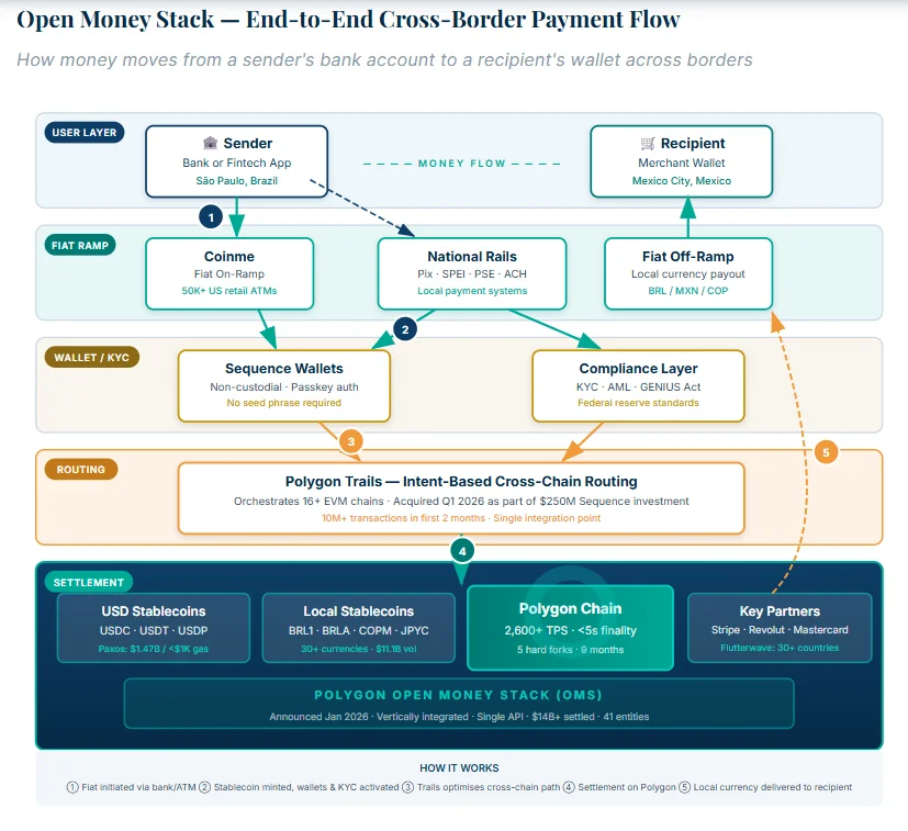 The Open Money Stack (OMS) is Polygon’s vertically integrated answer to fragmented payment infrastructure. It connects every layer, from fiat cash to blockchain settlement, in a single unified framework. The diagram below shows the complete end-to-end payment flow.