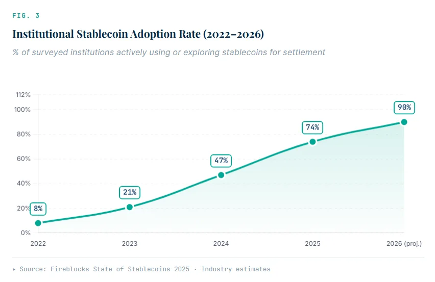 A Fireblocks survey found that 90% of institutional players now use or actively explore stablecoins for settlement. That figure was in single digits just three years ago.