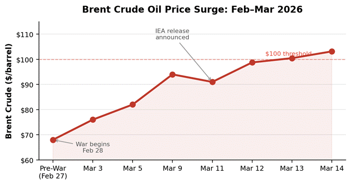 Figure 2: Brent crude price surge since the outbreak of conflict. Source: IEA, Fortune, CNBC