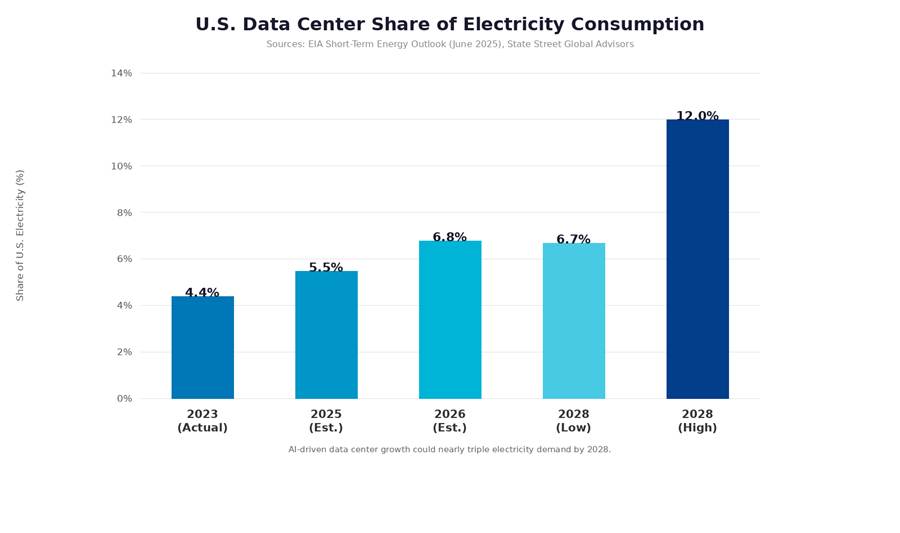 Figure 2: Data centers’ growing share of U.S. electricity consumption. Source: EIA, State Street Global Advisors.