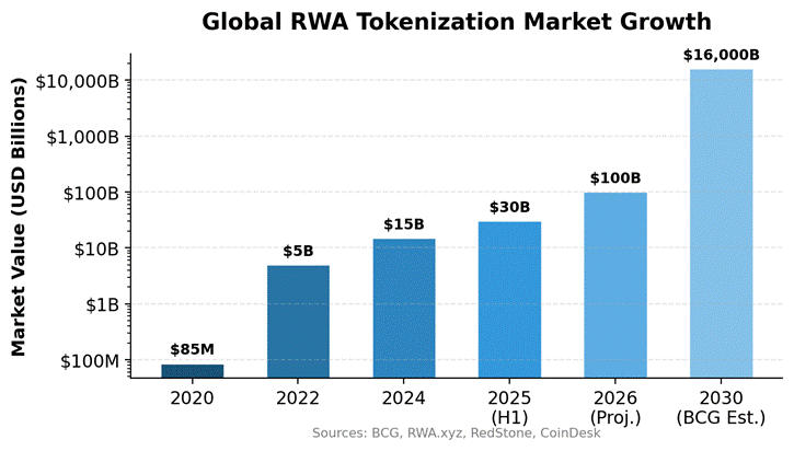 This deal comes at a time of rapid growth in real-world asset (RWA) tokenization. Indeed, the global RWA market grew by 380% over three years, reaching $30 billion by mid-2025. Furthermore, Boston Consulting Group thinks this sector could reach $16 trillion by 2030. Similarly, Standard Chartered sees an even bigger $30 trillion market by 2034.