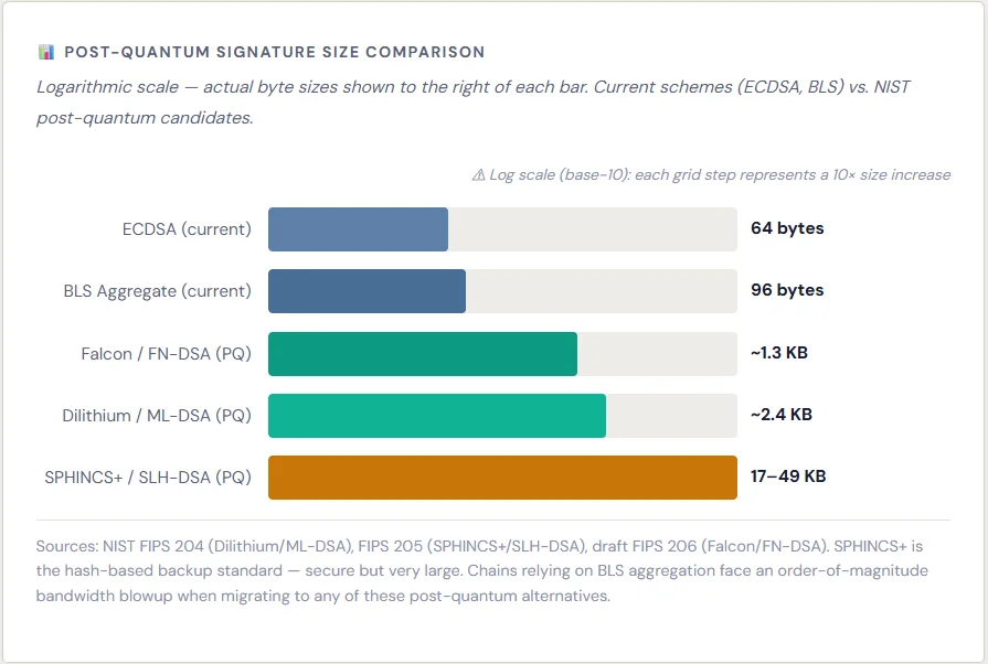 The problem, however, is severe. No NIST-approved post-quantum version of BLS aggregation exists today. Moreover, the quantum-safe options, Dilithium, Falcon, and SPHINCS+, do not compress well.