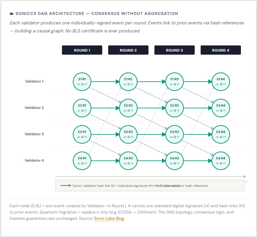 SonicCS avoids that problem by staying simple. It uses just two building blocks: one signature per event and one hash reference per link. As a result, when the industry shifts to NIST post-quantum standards, Sonic ships a routine software update. Other chains, by contrast, must ship a full redesign.