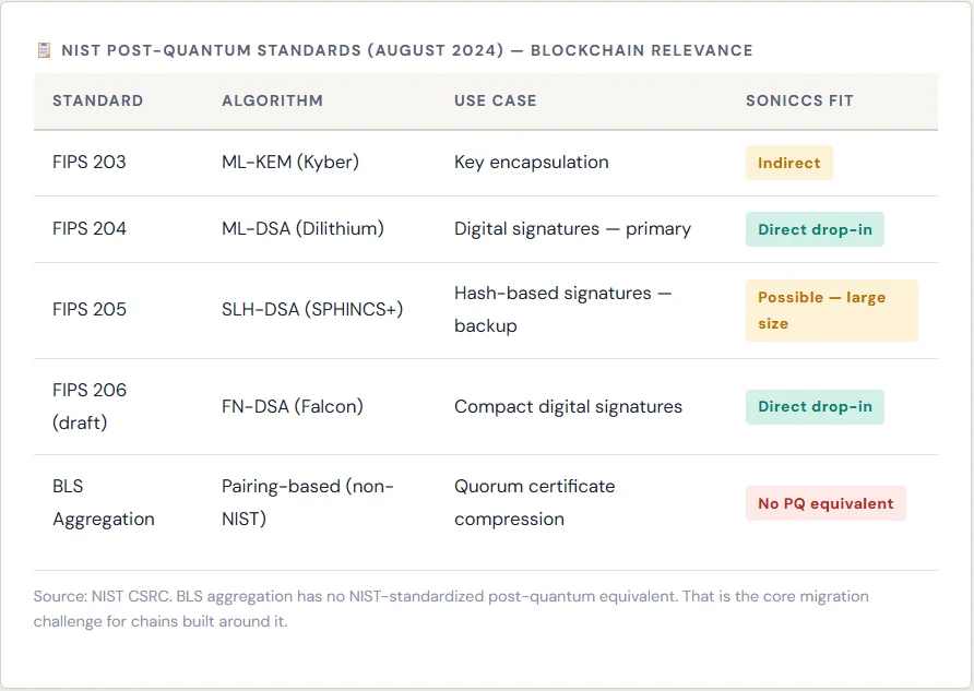 Sonic’s SonicCS consensus avoids BLS aggregation, the core obstacle to quantum migration.