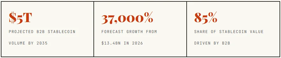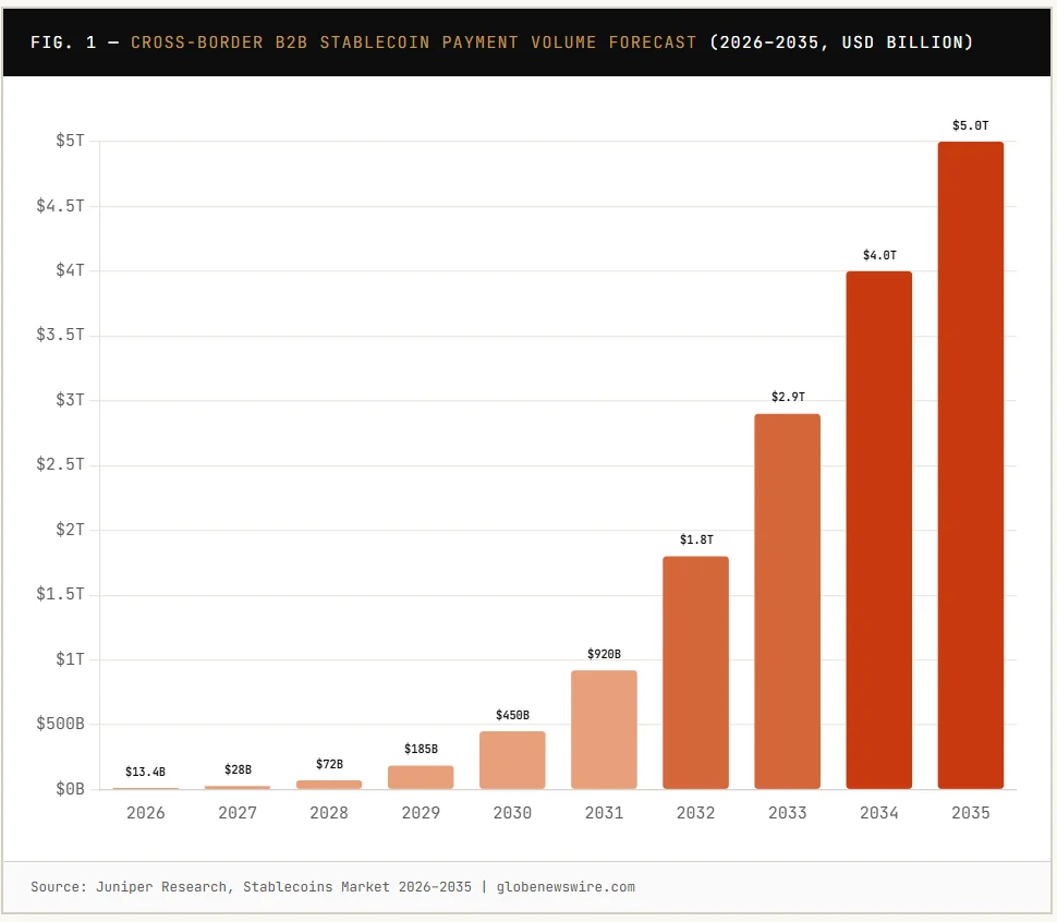 37,000% growth in nine years. Cross-border B2B stablecoin payments will surge from $13.4 billion in 2026 to $5 trillion by 2035, per Juniper Research.