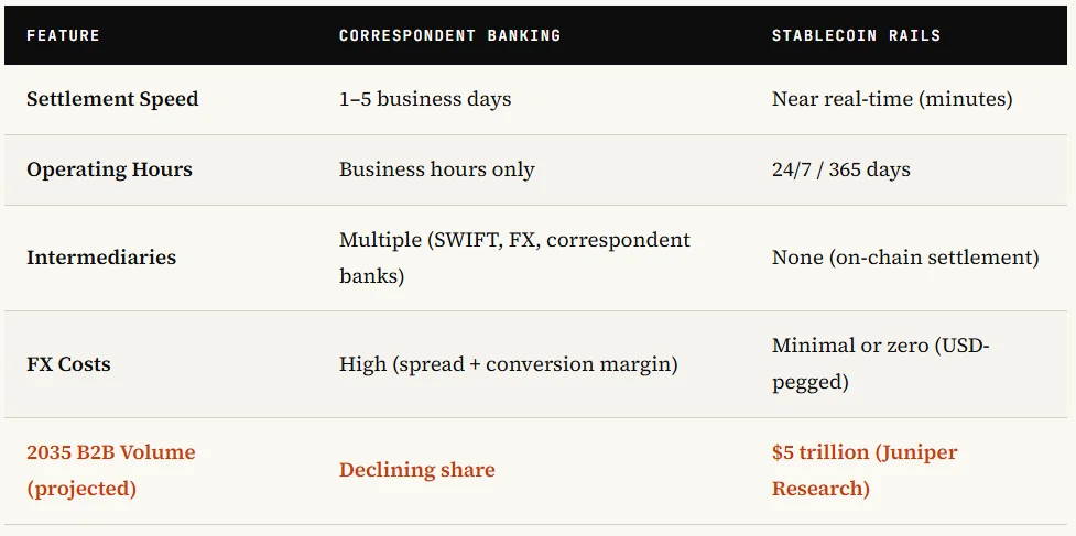 Correspondent banking is being disrupted. Stablecoins settle near-instantly, 24/7, with no intermediary fees, a direct structural advantage over SWIFT-based rails.