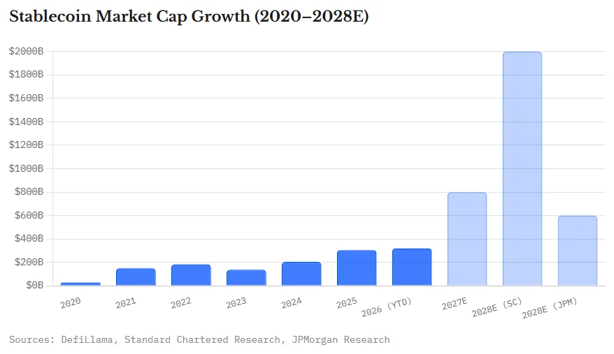 Standard Chartered maintains its $2T stablecoin market cap forecast for end-2028.