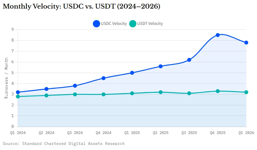 USDT, by contrast, serves a different market. Its velocity stays relatively flat. Emerging-market users hold it as a savings instrument. They park dollars, not spend them rapidly.