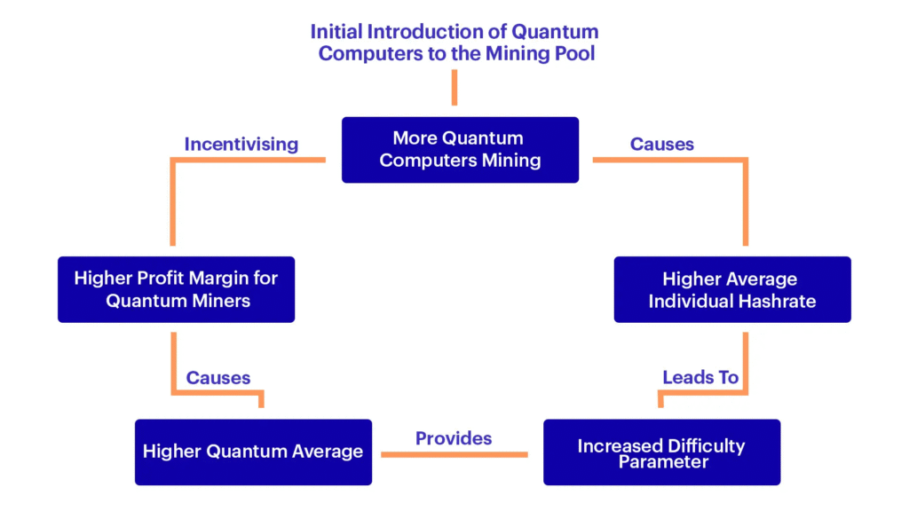 Introducing quantum computers into a PoW-based blockchain will consequently increase the total computational power a proof-of-work cryptocurrency network uses to process transactions, also known as the ‘Hash-rate.’ This will, therefore, shorten the average time it takes for the network to produce a block. It has been demonstrated that increasing the PoW difficulty parameter solidifies quantum computers’ quadratic mining advantage. More investment will be encouraged because the profit margins for quantum mining technologies will be higher than those for traditional mining technologies. With a greater incentive, more quantum miners will be on the network, reducing block time and increasing PoW difficulty. As traditional miners become unprofitable, a cycle develops in which quantum computing technology will eventually completely replace them. 4