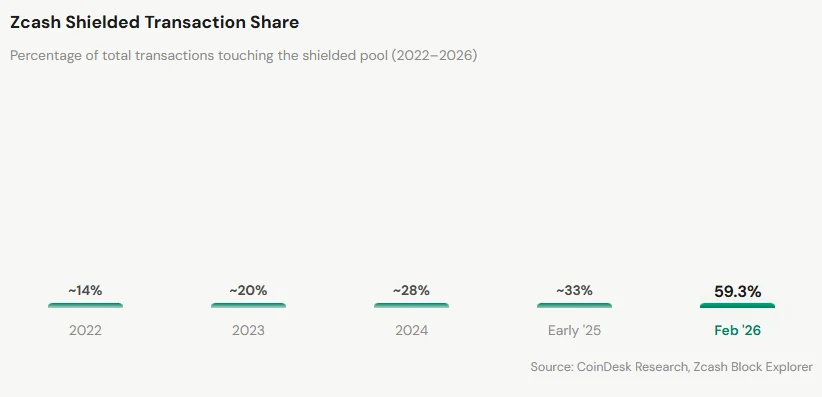 Crypto privacy is no longer a niche ideology. It is becoming a structural necessity. Zcash’s share of shielded transactions reached 59.3% in February 2026, nearly double its early 2025 rate. The driver was simple: wallet defaults changed.