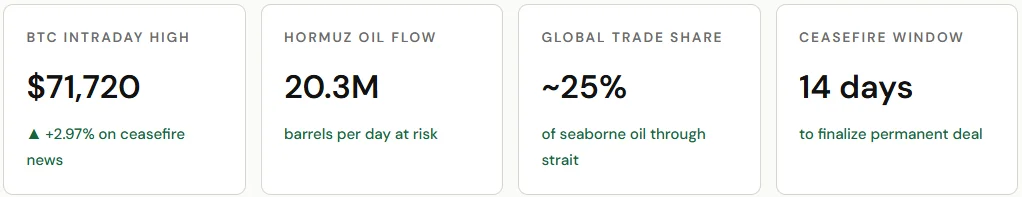 Analyst note: The ceasefire is conditional. Iran has not formally confirmed all terms as of publication. A breakdown in talks could sharply reverse BTC’s gains and re-pressurize energy markets.