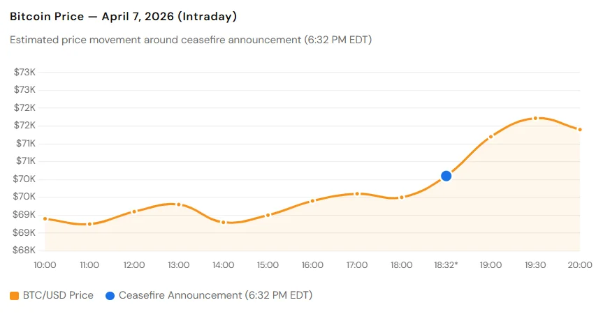 Bitcoin.com News reported the price spike alongside the ceasefire announcement. The correlation is clear: reduced conflict risk removes a key macro headwind for risk assets. Bitcoin benefits first.