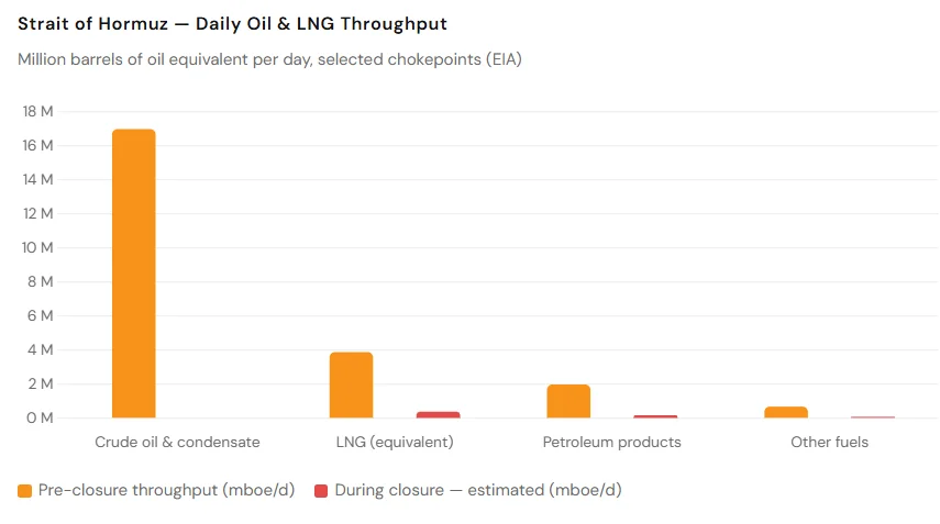 The strait is the world’s most critical oil chokepoint. According to the US Energy Information Administration (EIA), it carries approximately 20.3 million barrels of oil daily. That figure represents roughly 25% of all seaborne oil globally.