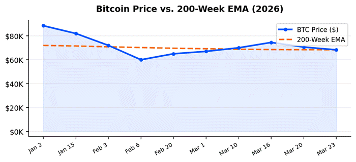 The dip brought Bitcoin to its 200-week exponential moving average near $68,300. This indicator served as reliable support in prior cycles. However, in 2026, it has repeatedly failed to hold.