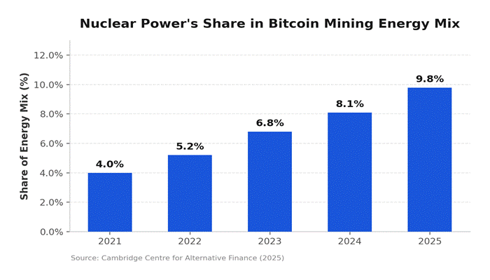 Figure 1: Nuclear power’s growing share in Bitcoin mining, 2021–2025