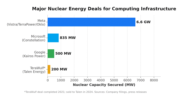 Meanwhile, Big Tech is racing to replicate this model. Microsoft signed a 20-year agreement with Constellation Energy to restart Three Mile Island Unit 1. In addition, Meta announced deals with Vistra, TerraPower, and Oklo for up to 6.6 GW of capacity by 2035.