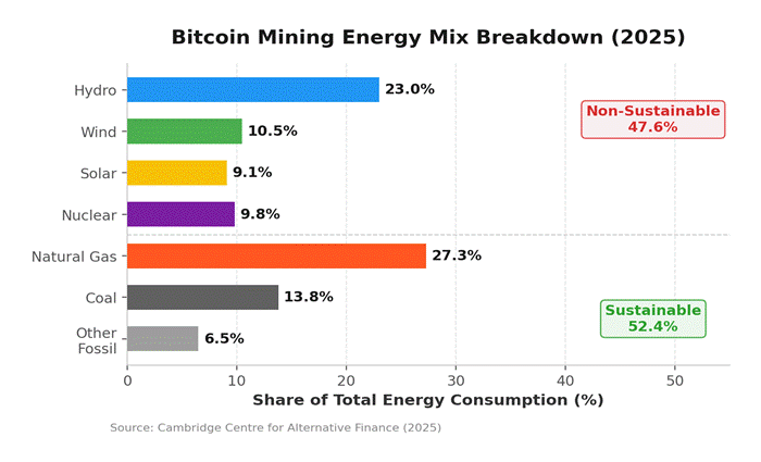According to the Cambridge Centre for Alternative Finance, 52.4% of Bitcoin mining’s electricity now comes from sustainable sources. Notably, nuclear power alone accounts for 9.8% of that mix. In contrast, that figure stood at just 4% back in 2021.