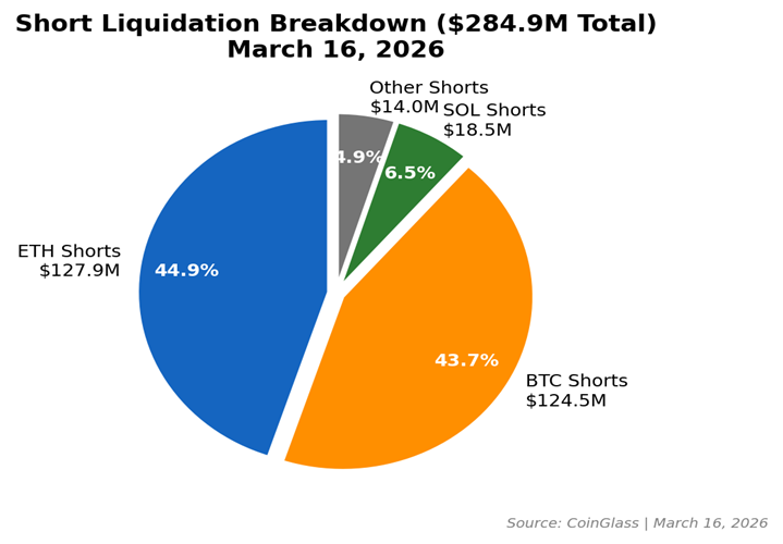 - Short liquidations hit $284.9M. Ether shorts led at $127.9M.