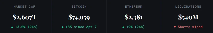April 15, 2026 – Bitcoin surged to a session high of $74,959 on April 14. Global crypto capitalization rose 3% in a single day. Short sellers faced $540 million in forced liquidations.