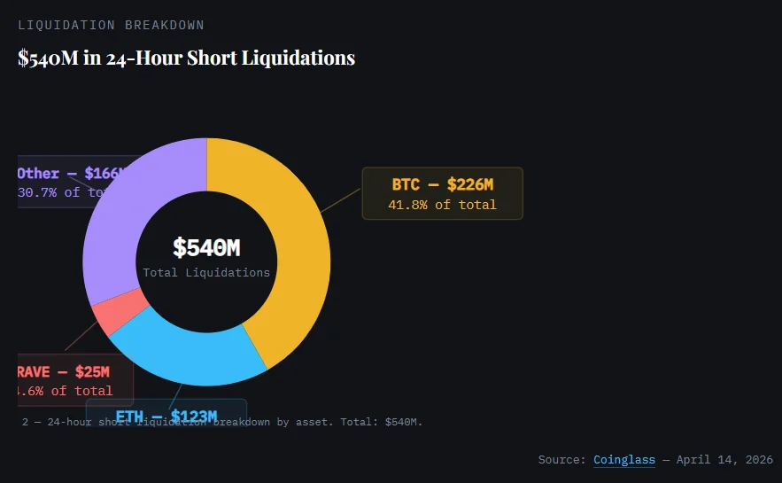 Total liquidations reached $540M, with $226M in bitcoin short positions alone.