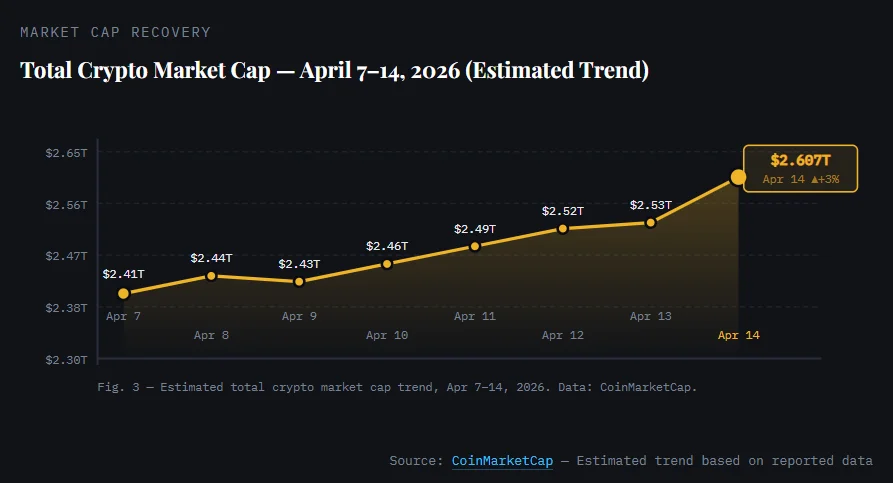 The total crypto market capitalization crossed $2.6 trillion on Tuesday, April 14, 2026. This marks a rise from the $2.53 trillion recorded on Monday afternoon. The gain of roughly 3% came within a single overnight session.