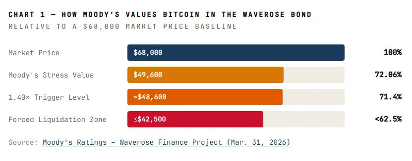 “Moody’s stressed the collateral at 72.06% of market value. Mapped to Bitcoin’s April 1 price near $68,000, the stress zone lands at approximately $49,600, nearly identical to Standard Chartered’s stated bear-case target.”