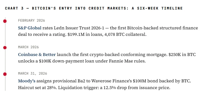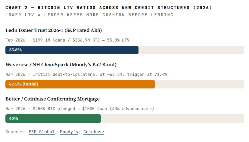 The Waverose deal is not a one-off. In February 2026, S&P Global assigned the first-ever rating to a Bitcoin-backed structured finance deal: Ledn Issuer Trust 2026-1. That transaction contained roughly $199.1 million in loans secured by 4,078 BTC worth about $356.9 million, an implied LTV of 55.8% at inception.