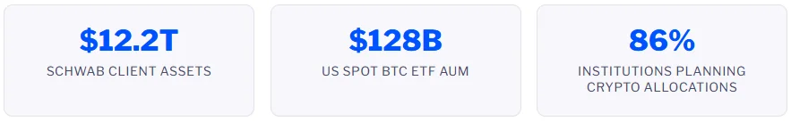 Schwab’s move is not simply another brokerage adding crypto. The firm manages more than $12 trillion in client assets. That figure exceeds the entire cryptocurrency market capitalization. It signals a structural shift in how mainstream investors access digital assets.