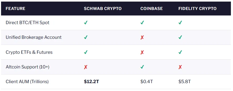Schwab manages $12.2 trillion in client assets. Its crypto entry dwarfs existing players.