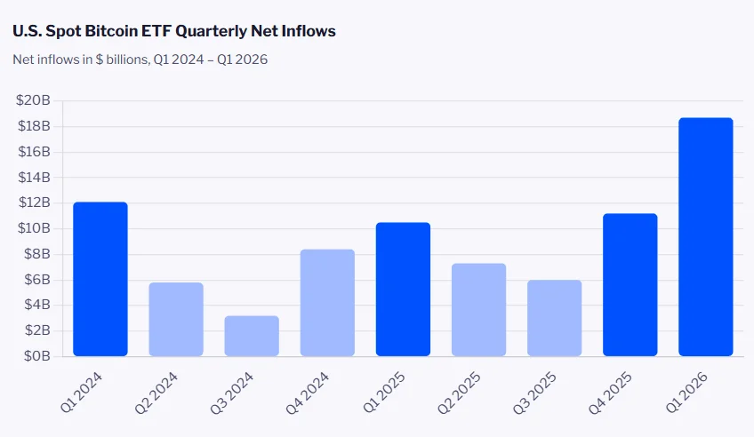 U.S. spot Bitcoin ETFs have accumulated over $128 billion in AUM and $65 billion in cumulative net inflows since their January 2024 approval. Q1 2026 alone saw $18.7 billion flow in. BlackRock’s IBIT leads with roughly 45% market share, per industry data.