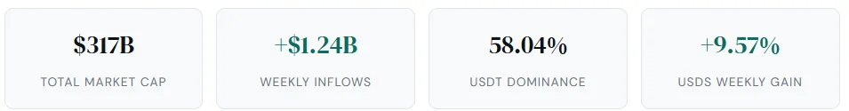 Ethena’s yield-bearing USDe ranked fourth at $5.888 billion. It dipped just 0.26% for the week. Together, the top five assets account for 87.1% of the $317.134 billion total market.