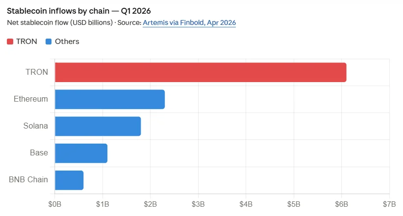 Furthermore, in Q1 2026, TRON led all chains in net stablecoin inflows. Artemis data cited by Finbold puts TRON’s net flow at +$6.1 billion. By contrast, Ethereum came in well below that figure.