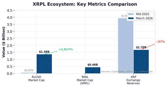 Figure 2: XRPL Ecosystem Key Metrics Comparison — Sources: CryptoSlate, 21Shares, Cryptopolitan