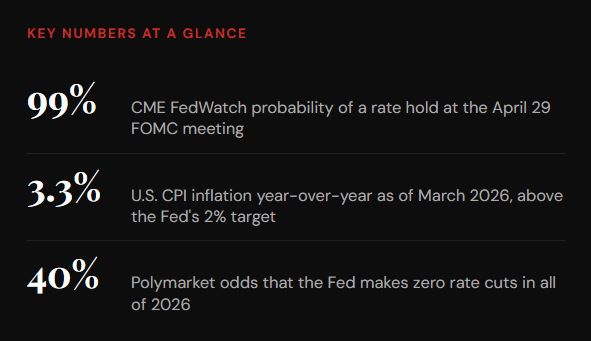 Until either of those numbers arrives, the market’s base case holds firm. The Federal Reserve stays on hold. Rate cuts remain a distant prospect for 2026. The April 29 FOMC meeting is expected to confirm what traders have already priced in.