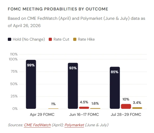 April 28, 2026 – Prediction markets and CME futures converge on one outcome. The Fed will stand pat on April 29 and likely through the summer. Elevated inflation and a softening jobs market are keeping policymakers frozen.