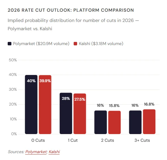 Kalshi’s equivalent annual market echoes that view. Zero cuts lead at 39.9%. One cut stands at 27.5%. Two cuts are priced at 15.8%. Kalshi’s contract has attracted $3.18 million in total volume. Together, these figures paint a unified picture.