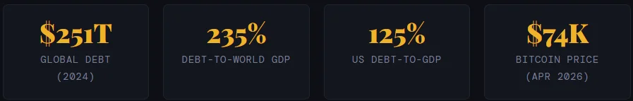 Kiyosaki’s alarm is not entirely without basis. According to the IMF’s Global Debt Monitor, total global debt hit $251 trillion in 2024. That equals 235% of world GDP. Public debt alone rose by 1 percentage point of GDP in a single year.