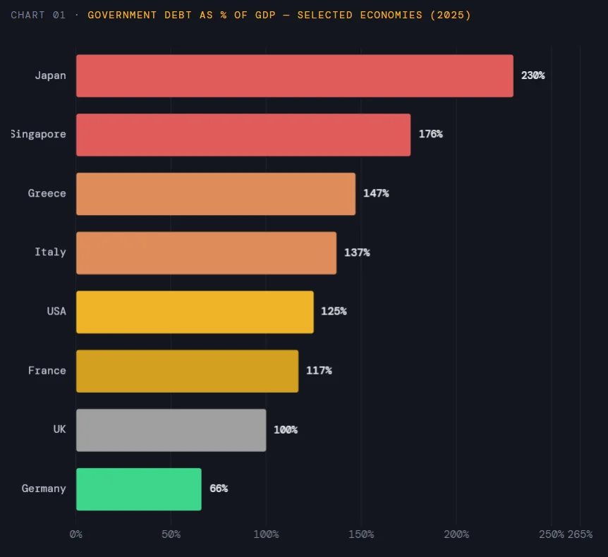 The IMF’s April 2026 World Economic Outlook is titled “Fiscal Policy Under Pressure: High Debt, Rising Risks.” The title alone signals institutional concern. US debt-to-GDP now stands at 125%, according to IMF calculations. Japan leads globally at 230%. France sits at 117%.