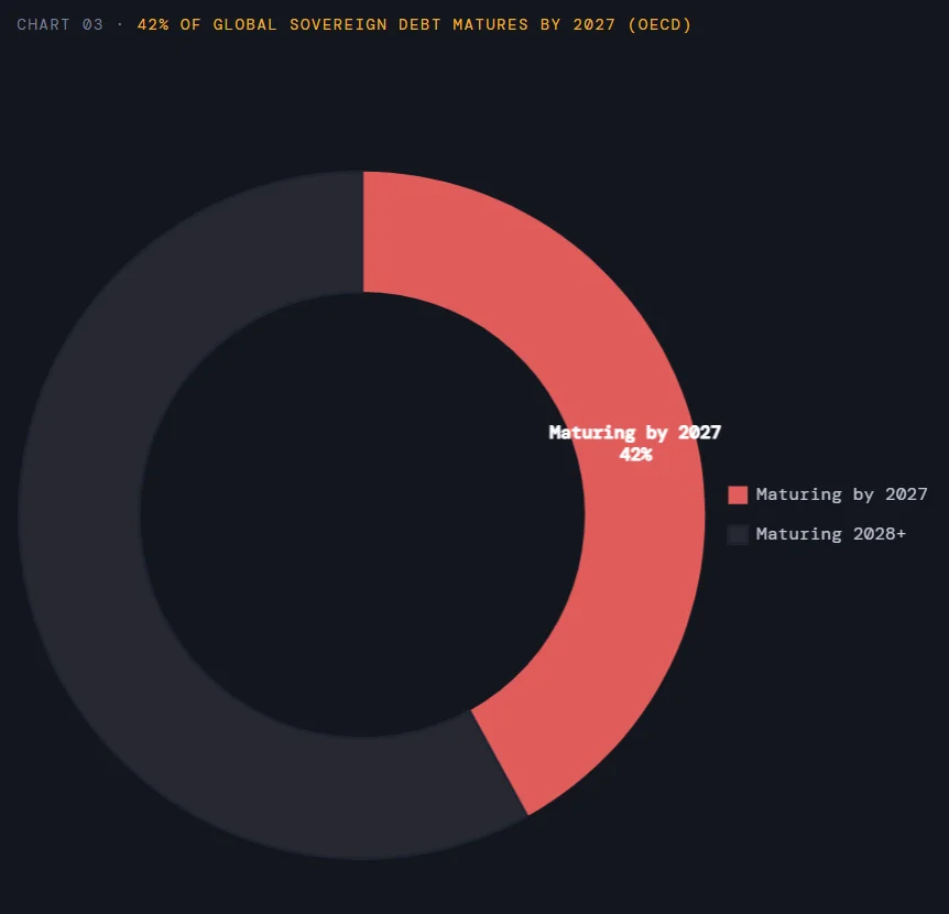 The OECD’s Global Debt Report 2025 adds further context. It warns that 42% of all global sovereign debt matures by 2027. Much of it was issued at near-zero rates. Refinancing at today’s higher rates could severely strain government budgets.