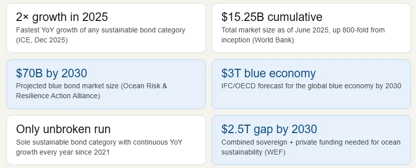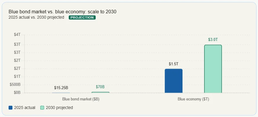 Yet with $1.1 trillion in total sustainable bonds issued globally in 2025, and blue bonds finally doubling, the conditions for a deeper, more liquid market are materializing fast.