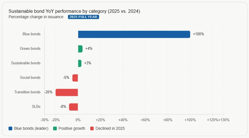 The blue bond market has turned a structural corner. ICE’s full-year 2025 report confirmed that issuance more than doubled between 2024 and 2025. No other sustainable bond category matched that rate of expansion.
