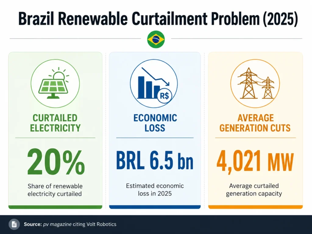The timing is important. Brazil failed to use around 20% of its solar and wind electricity in 2025. That resulted in estimated losses of BRL 6.5 billion, or about $1.23 billion, according to data from Volt Robotics reported by PV Magazine.
