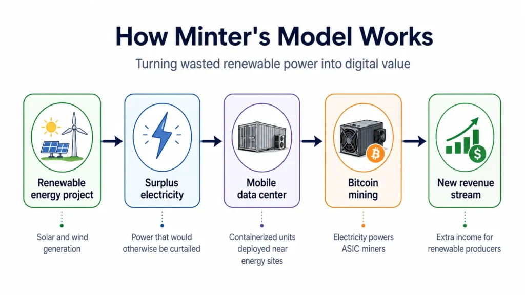 Minter’s model is simple but powerful. It places container-based data centres near renewable energy projects. These units can consume surplus electricity that would otherwise be curtailed. That makes Bitcoin mining a flexible buyer of stranded power.