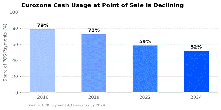 Fig 1: Eurozone cash usage at point of sale — Source: ECB Payment Attitudes Study 2024