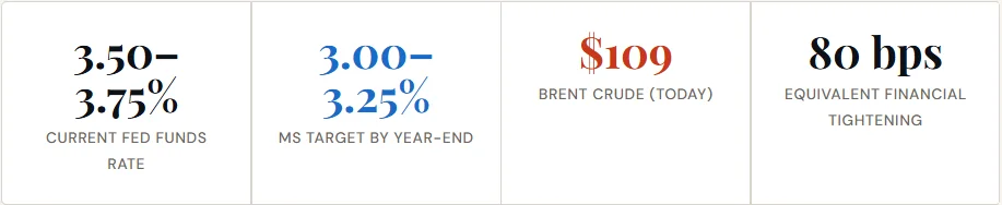 Markets have already done some of the Fed’s work. Morgan Stanley estimates that higher oil prices, a stronger dollar, and rising equity risk premiums are equivalent to roughly an 80-basis-point rate hike. That is significant. It reduces the need for additional policy restraint from the central bank.