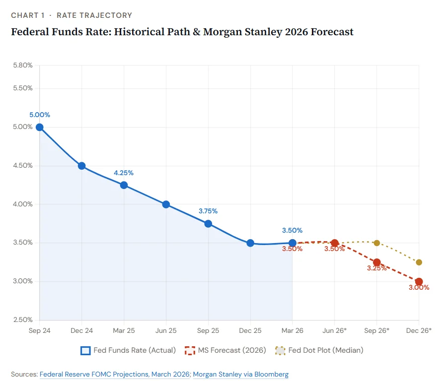 The Fed’s current policy rate stands at 3.50%–3.75%; MS targets 3.00%–3.25% by year-end.