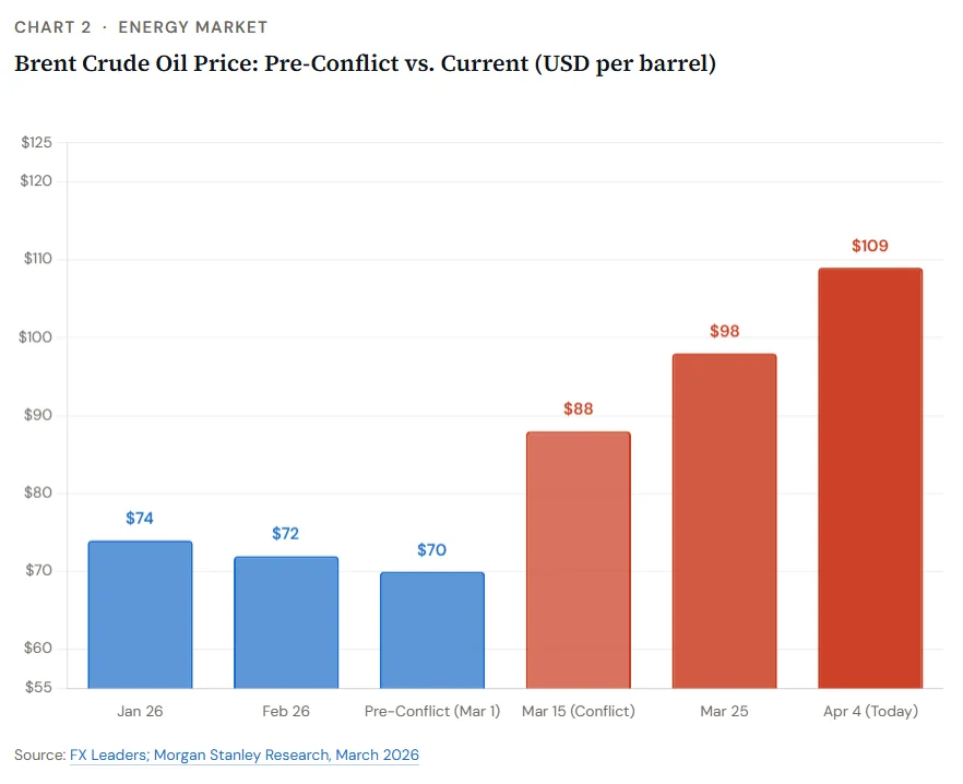 Brent crude surged from ~$70/bbl pre-conflict to over $109/bbl today, a 56% spike.